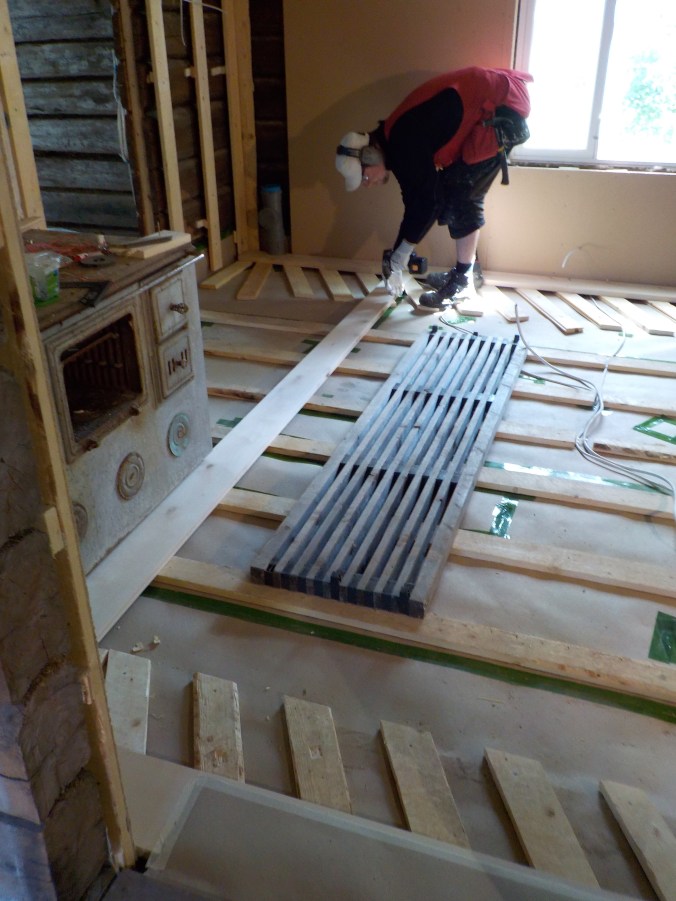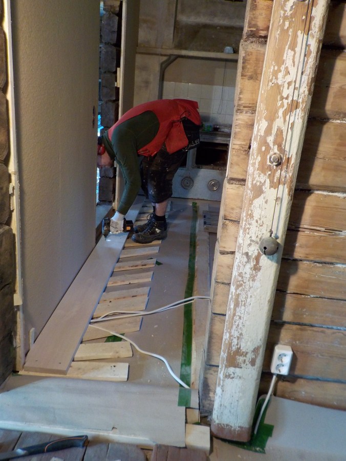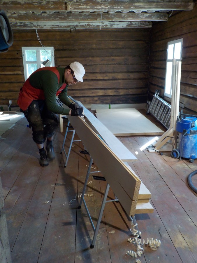 Yläkertaa ei kauheasti ole joudettu edistämään, eikä sen kanssa kiirettä olekaan. Tarkoitus on saada eristettyä välipohja tässä kesän/syksyn aikana. Välipohjaan (makkarin ja keittiön kattoon) on porattu reiät alakerran kattolamppuja varten. Miehet askartelivat reikien päälle laatikot, joihin lamput muuntajineen sijoitetaan alhaalta käsin. Välipohjaan on tulossa ilmansulkupaperi ja sen päälle ekovillaa.