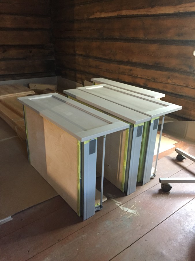Maalari pääsi töihin 🙂 Ensimmäisenä työn alle otettiin saareke. Se koostuu kahdesta 80 senttisestä laatikostosta ja apteekkarin kaapista.